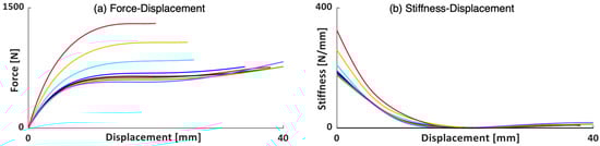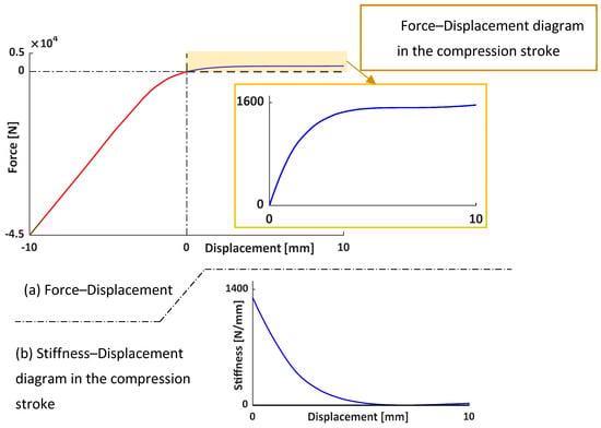 The comparison between the force–displacement and stiffness–displacement characteristics is depicted in Figure 25. The main source of error is concentrated on the final part of the compression stroke, where a significant portion of compression and sliding between adjacent walls occurs.