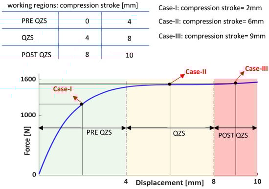 The results of the simulation are presented in Figure 24, which displays the force–displacement characteristics of the models at different Young’s Moduli (E). The error for each FEA is defined by considering the experimental results as the reference data for two different regions: region 1: and region 2: . Among the simulations, and exhibit the closest fit to the experimental results (blue and red solid lines in Figure 24, respectively), considering the overall error. Although the simulation carried out using has a slightly lower overall error, the model chosen for multibody correlation is the one obtained using . This decision is based on the lower error observed in the compression strokes ranging from 0 to 20 mm (Region 1), a critical zone where the QZS behavior is of particular interest.
