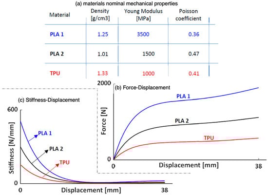 The second step is to select the material for the 3D printing, which uses a fused filament fabrication process and a thermoplastic material filament. Two types of materials are considered (PLA and TPU), which are commonly used for 3D printed components. The principal nominal mechanical properties of these materials are listed in Figure 20a; it is worthwhile to point out that these values can significantly vary during the printing process due to several factors: moisture, room temperature, extrusion temperature, and material contamination. Before conducting the experimental text, a numerical simulation is conducted for each material, utilizing the KOM-III.3 origami under a compression of 38 mm. This simulation aims to determine the most suitable material for the prototype and subsequent tests.