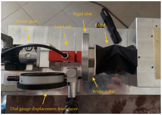 The test setup, shown in Figure 22, comprises a 30 mm thick aluminum base made of a rectangular plate to which an aluminum cube is clamped in order to have a rigid frame support on one side (right side in Figure 22) and, on the other side, a worm gear attached to a rigid aluminum disk (left side in Figure 22). A load cell has been placed between the worm gear mechanism and the disk to measure the force exerted by the KOM during the compressive stroke. The final component of the test setup is a dial gauge displacement transducer, which measures the displacement of the circular plate during compression. The KOM prototype is situated between the cube and the plate, supported by a circular support (see Figure 22). The entire assembly is securely clamped to prevent any base movements that could compromise the accuracy of the measurements.