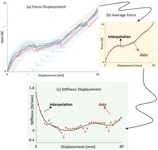 Experimental results: (a) Force–displacement; (b) Average Force; (c) Stiffness–Displacement ▬ try-1; ▬ try-2; ▬ try-3; ▬ try-4; ▬ try-5; ▬ try-6.