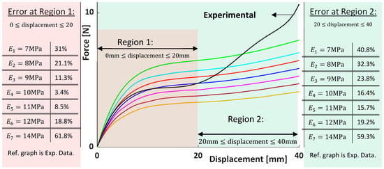 The first step of the correlation analysis is to establish a FEM model that accurately replicates the results obtained from the experimental tests. Throughout the 3D printing process, the mechanical properties of the materials may exhibit significant variations from their nominal values. Indeed, they are influenced by several environmental factors. Another distinction between the modeled and 3D-printed KOM lies in the manufacturing process. The KOM model is directly derived from the 3D CAD model. It incorporates sections between two external walls that are uniformly filled with material distributed in an ideal manner. However, the 3D printed model may exhibit slight differences due to the manufacturing process. Factors such as infill parameters, density, geometric pattern, orientation, and wall thickness can be defined prior to the 3D printing process. Each of these factors significantly impacts the mechanical response of the 3D-printed model [30]. The parameters, modified to fit the experimental test, are the material properties (isotropic): Young’s Modulus (E) and Poisson coefficient (). The first study is conducted by varying Young’s Modulus and considering TPU material with a constant Poisson coefficient, i.e., the TPU nominal one, this range spans from 14 MPa to 7 MPa [31].