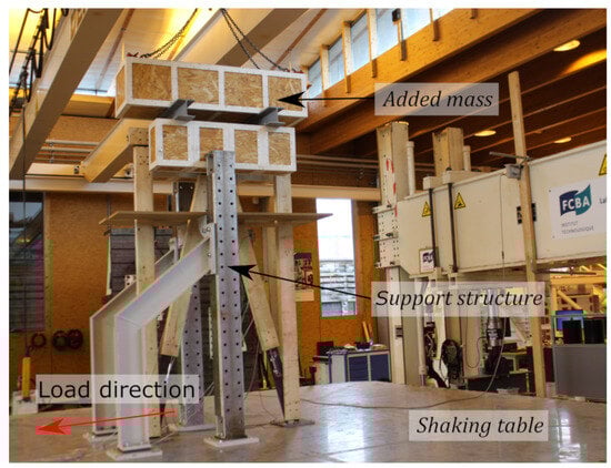 The tests were conducted on the unidirectional shaking table at FCBA. The braced test frame was rigidly fixed to the table (Figure 2). A horizontal metal plate was welded to the base joint and clamped to the shaking table with four bolts, each 16 mm in diameter. A steel support structure was positioned on each side of the braced frame to guide its movement and prevent lateral collapse. Several boxes filled with lead bags were attached to the top bar to simulate the load of upper stories (one on the top and two on the sides of the structure). For safety, the top box was secured to the bridge crane with a steel chain.