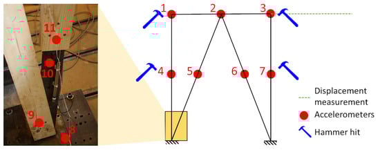 Accelerometers were installed at various points on the structure, particularly at the edges of the specific joints (Figure 3). The displacements of the upper point of the structure were measured using a wire sensor, while the displacement, acceleration, and force of the shaking table actuator were monitored. All the sensors measured values in the longitudinal direction, except 1 and 3, which were three-dimensional. The transverse acceleration was one order of magnitude lower than the longitudinal acceleration.
