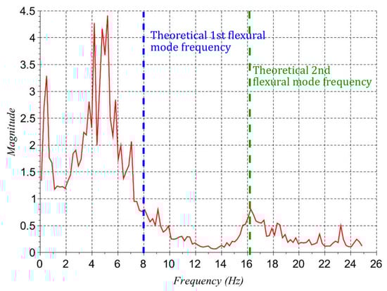 The first bending mode expected at about 8 Hz was not detectable at all on the transfer function. The second flexural mode, expected near 16 Hz, corresponded to a peak in Figure 5 but had a very small amplitude. The structure dissipated most of the input signal’s energy, and the damping phenomenon primarily affected the lower frequencies. To gain further insight, an additional experimental modal analysis was conducted to evaluate the linear modes of the structure.