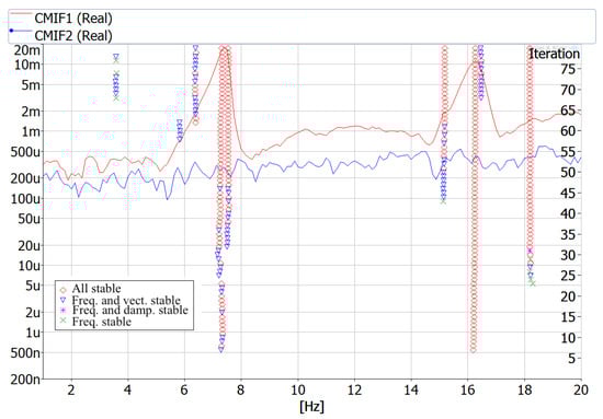 Experimental modal analysis (EMA) was performed using an impact hammer and PULSE-23 [21] software. Accelerometers were positioned along the frame, and several impacts were applied using an instrumented impact hammer (Figure 3). For each position, five hammer strikes were executed perpendicularly to the beam, and the mean transfer function was recorded. Each impact was required to have a roughly equivalent magnitude (700 N). Mode identification by the software was performed using the Rational Fraction Polynomial Method [22] with the help of a stability diagram (Figure 6). The stability diagram method is an efficient approach for identifying multiple modes. It is constructed by progressively increasing the number of assumed modes and applying curve-fitting methods to identify modal frequencies from a set of frequency response functions (FRFs). Modes whose characteristics remain consistent across iterations are considered “real” modes. Additionally, the CMIF (Complex Mode Indication Function) was used to facilitate the identification of the system’s experimental eigenvalues [23]. This study focused on the first four modes, as they were the only ones clearly identified through the experimental modal analysis.