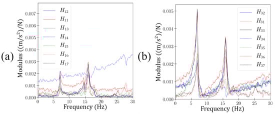 Transfer function of the impact response of the structure for hammer impacts at points 1 (a) and 3 (b). The letter i corresponds to the impact points and j to the measurement points, as defined in Figure 3.