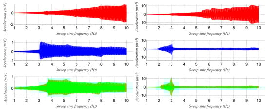 Examples of the time evolution of the acceleration for the first frame with table displacement amplitudes of ±0.5 cm (left) and ±2.5 cm (right). Red: shaking table acceleration. Blue: top structure acceleration—sweep down. Green: top structure acceleration—sweep up. The time is expressed according to the frequency of the input signal during the sweep up and the sweep down.