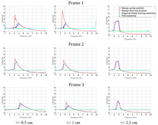 The sweep direction influenced the structure’s dynamics. For a table displacement amplitude of cm, the signal amplification was maximal around 4 Hz during the upward sweep, whereas it peaked around 3 Hz during the downward sweep. During the downward sweep, a sudden jump in the signal deviated from the symmetrical response typical of linear oscillators. Additionally, the shape of the output signal and the resonance frequency were highly dependent on the input signal’s amplitude. These characteristics are indicative of a non-linear mode, as demonstrated by Noël and Kerschen in aeronautical applications [16] and predicted by theory [11,27]. The frequency response function (FRF) of three frames for the three input signal amplitude is shown in Figure 9. The output signal shape varied with magnitude: at low amplitudes, the structure exhibited a softening behaviour, with the backbone curve connecting the amplitude peaks sloping towards lower frequencies. At higher amplitudes, the magnitude peak flattened. This change in behaviour was observed by Renson [15] in a two-degrees-of-freedom non-linear system with clearance, further confirming the non-linear behaviour of the structure.