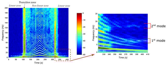 The input signal was a logarithmic sine sweep that rose and fell between 1 and 10 Hz according to Equation (1). This explains the arrow shape on each graph for low frequencies. Several harmonics at higher frequencies were also visible. The time–frequency diagrams display three domains: a linear zone, a transition zone, and a non-linear zone (Figure 10). When the frequency of the input was lower than the frequency of the non-linear mode (for a time less than 100 s or greater than 320 s in Figure 10), the behaviour of the structure appeared linear. In these zones, the energy remained mainly at the frequencies of the input signal. The input signal also slightly activated the first linear mode of the structure at 8 Hz and 16 Hz (see Figure 10).