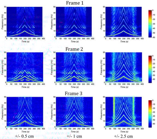 Time–frequency analysis was performed using the EasyMod toolbox [28]. A Fast Fourier Transform (FFT) of the signal was computed over small periods of time and the acceleration magnitudes of the response were displayed with different colour intensities in dB relative to the maximum acceleration. A rectangular window was used to avoid attenuating meaningful data. Figure 10 shows the time–frequency plots of frame 3 for a magnitude of the input signal of 2.5 cm, Figure 11 shows the time–frequency diagrams of frame 3 for a magnitude of the input signal of 2.5 cm, and Figure 10 presents the time–frequency graphs for the three frames for the three levels of amplitude. As mentioned before, frame 1 had been subjected to different tests before the sine-swept experiments, and its dynamical properties might have been altered (damages on joints). Furthermore, the sample rate was four times lower for frame 1 (256 Hz) than for frames 2 and 3 (1024 Hz).