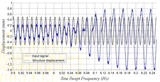 Non-linear dynamics in structures can be accurately identified by applying a logarithmic sine sweep at the base [16,25], provided that the sweep rate is low [26]. As the first resonance frequency was not identified with the white noise test, it was decided to use a displacement constant sinusoidal sweep that produced an acceleration that grew with the frequency of the signal (see “shaking table” signal in Figure 8 and Equation (1)). The sweep rate was fixed to 1 octave/minute from the frequency of 1 Hz.