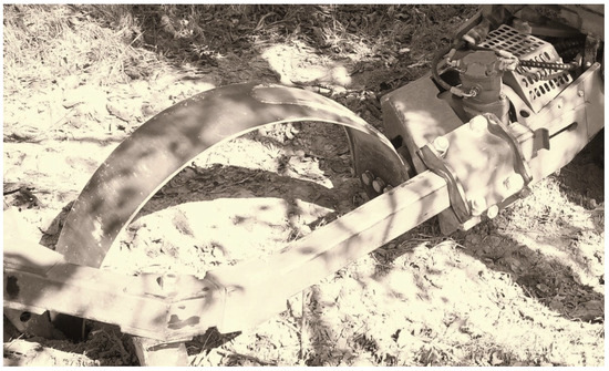 This latest information has given rise to the first optimization of an oscillator designed to vibrate the semicircular blade (Figure 1) in the tree digging machines [30,31] used to cut a hemispherical clod of soil containing the root system of the tree in the nursery. The blade cutting the soil must move with a rotary motion for an arc of π rad and, at the same time, vibrate thanks to the mechanical oscillator mechanically powered in turn by the engine of the tree digger machine. After cutting the clod, this, together with the tree, is transported and planted in orchards or gardens.