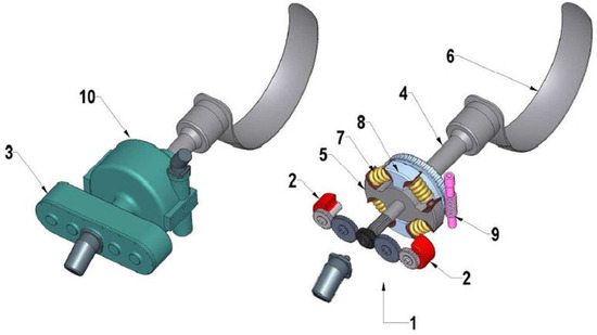The oscillator blade system: (1) gear wheels; (2) eccentric masses; (3) gear housing; (4) shaft; (5) horizontal butterfly bush; (6) semicircular blade; (7) springs; (8) vertical butterfly bush; (9) worm screw; (10) worm gear housing.