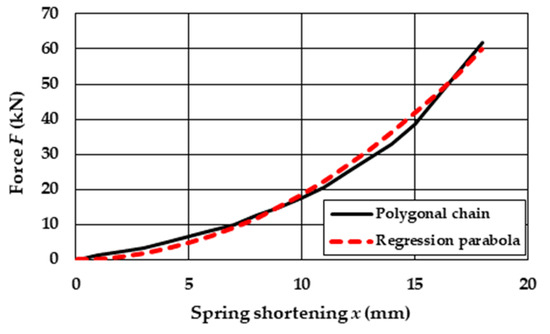 By continuing to increase the force F, the other turns will also come into contact one after the other, with further increases in stiffness. Figure 4 shows the resulting force F vs. shortening x diagram of the conical coil spring of Figure 3. A regression quadratic parabola (R2 = 0.992) was constructed over the monotone polygonal chain: