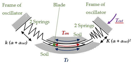 Single degree of freedom system to which the oscillating blade within the soil can be traced under the effect of the excitation torque Tem, the friction torque TF, the springs torque k·(α + αcut) + K·(α + αcut)2, and the cutting torque Tcut.