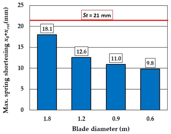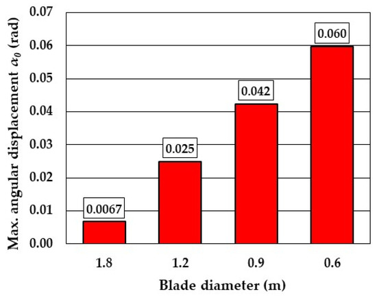 The values of the maximum angular displacement α0 obtained by applying Equations (21)–(23) for the various blade diameters are shown in the histogram in Figure 6.