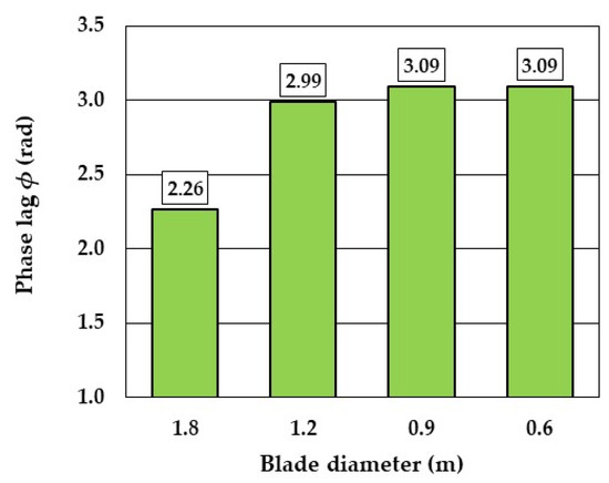 The phase lag ϕ calculated with Equation (24) between the excitation torque Tem, intended as a rotating vector, and the maximum angular displacement α0, also as a rotating vector, is shown in the histogram in Figure 8. The values are 2.265 rad (129.8°), 2.988 rad (171.2°), 3.091 rad (177.1°), and 3.094 rad (177.3°), respectively. The small blade (0.6 m) and the medium blade (0.9 m) have phase lags close to π rad (180°) due to the low values of the friction torque TF compared to the excitation torque Tem (Table 2).