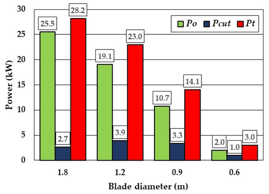 Figure 11 shows a comparison between the four blade diameters, 1.8, 1.2, 0.9, and 0.6 m, of the theoretical powers (i.e., net of transmission efficiencies) required for the oscillation Po and for soil cutting Pcut. The power required for oscillation Po was calculated with Equation (28); the power required to push the blade into the soil while cutting Pcut was calculated with Equation (29); the total power Pt was the sum of the previous two. It is interesting to note the high oscillation power Po required for 0.9 and 1.2 m blade diameters. This is due to the high excitation frequency that influences, with its square, the excitation torque Tem (see Equation (12)), on whose value Po directly depends (Equation (28)). It is possible to reduce the power Po for the 0.9 and 1.2 m blades by lowering the excitation frequency, as has been achieved for the 0.6 m blade, without excessive loss of maximum blade displacement A0. In fact, the reduction in ω determines its approach to the value of the natural frequency and, therefore, an increase in A0, which compensates for the reduction in A0 produced by the lower value of Tem. In the case of a very large blade of 1.8 m, its natural frequency is approximately ten times lower than the value of ω = 420 s−1. However, as much the latter is reduced, it always remains very far from the value of the natural frequency; therefore, the recovery of A0 is very limited so as to not compensate for the decrease in A0 due to the reduction Tem.