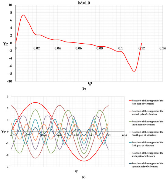 Calculation graphs of the magnitude of the driving forces of a vibration device with asymmetric oscillations with the total driving force = 10 kN and the specified asymmetry coefficient = 7.0. (a) is support reactions of each of the seven pairs of vibrators with the value = 1 kN and the initial phases ; (b) is the sum of the support reactions of all seven pairs of vibrators with the initial phases ; (c) is the support reactions of each of the seven pairs of vibrators with the initial phases , (d) is the sum of the support reactions of all seven pairs of vibrators with the initial phases .