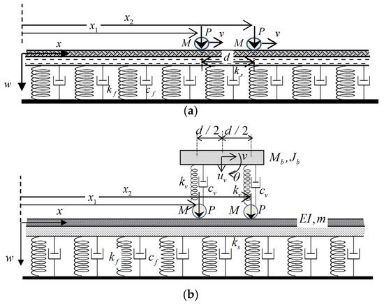 Figure 1. One-layer model: (a) traversed by two masses; (b) traversed by a single bogie.
