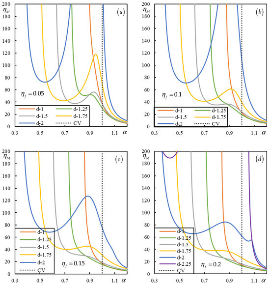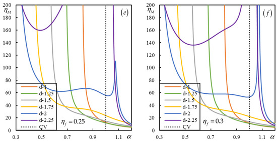 Figure 3. Instability lines for two moving proximate masses of equal value. Different colors represent various distances d ˜ = 1 : 0.25 : 2.25 , as indicated in the legend. The black dotted line marks the critical velocity. Parts (af) correspond to η f = 0.05 : 0.05 : 0.3 .