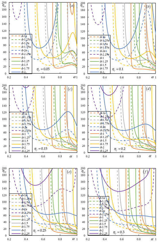 Figure 4. Instability lines for a moving bogie (solid lines) compared to two moving masses (dashed lines). Different colors represent various distances d ˜ = 1 : 0.25 : 2.25 , as indicated in the legend. Curves labeled ‘a’ have been adapted to represent the same total mass. Parts (af) correspond to η f = 0.05 : 0.05 : 0.3 .