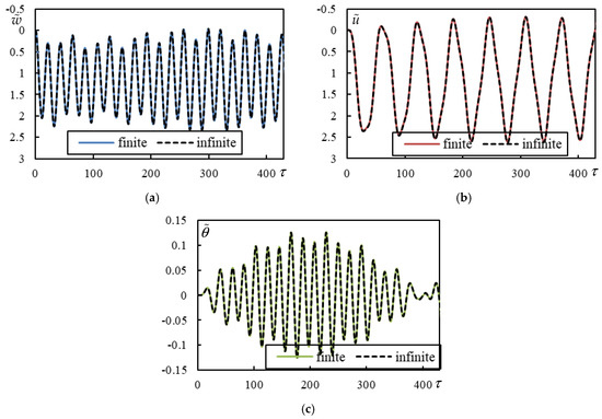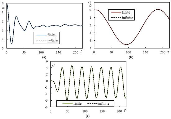 Figure 11. Time series in Case 4. Solid lines represent a finite beam, while dashed lines correspond to an infinite beam calculated using closed-form formulas. (a) Beam deflection at the rear mass; (b) bogie bar mass center displacement; (c) bogie bar mass center rotation.