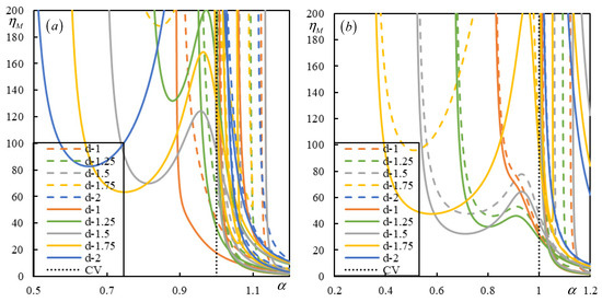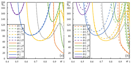 Figure 7. Instability lines for a moving bogie. Different colors represent various distances d ˜ = 1 : 0.25 : 2 , as indicated in the legend. Solid lines correspond to no damping in the suspension, while dashed lines correspond to a suspension damping value of η v = 0.05 . (a) c f 2 = 0.1 ; (b) c f 2 = 0.01 .
