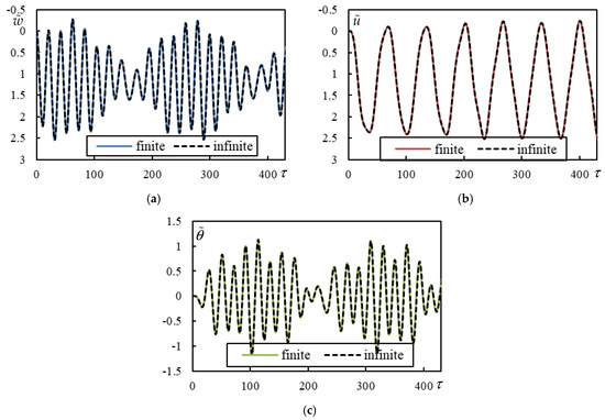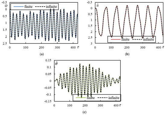 Figure 14. Time series in Case 6. Solid lines represent a finite beam, while dashed lines correspond to an infinite beam calculated using closed-form formulas. (a) Beam deflection at the rear mass; (b) bogie bar mass center displacement; (c) bogie bar mass center rotation.