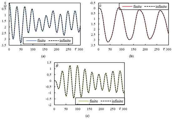 Figure 5. Time series in Case 1. Solid lines represent a finite beam, while dashed lines correspond to an infinite beam calculated using closed-form formulas. (a) Beam deflection at the rear mass; (b) bogie bar mass center displacement; (c) bogie bar mass center rotation.