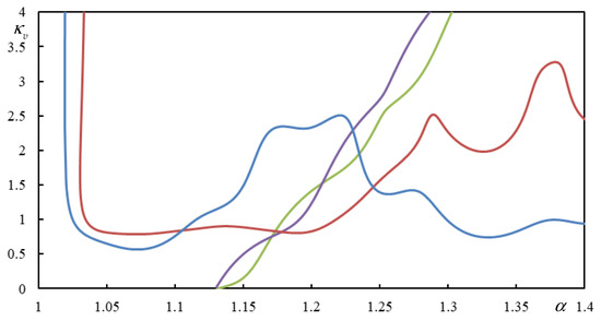 Figure 16. Critical stiffness of the primary suspension using data from [67] (different colors indicate different roots of the characteristic equation).