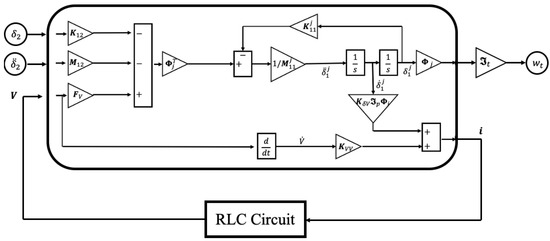 Shunt circuits offer an effective approach for preserving structural integrity and mitigating oscillations by suppressing unwanted vibrations arising on critical components while requiring only minimal electrical components and a simple hardware setup. Leveraging both series and parallel configurations, they provide a reliable means of dissipating vibration energy, promoting smoother operation, and enhancing structural longevity [44]. The vibration damping control framework utilizing shunt circuits implemented in this study is depicted schematically in Figure 3, where it can be noted that the electrical current through the piezoelectric stack, representing the output of the resolving system, is fed back into the circuit. Subsequently, the voltage generated across the circuit serves as the input, enabling the piezoelectric stacks to perform the stabilizing control action.
