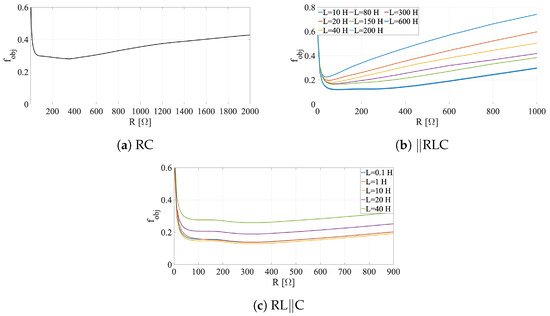 The tuning of the shunted circuits electrical components is first presented in this section. Given the electric capacity of the piezostacks [32] F, the inductance L and resistance R of the shunt circuits have been tuned carrying out a parametric study which aims to find the combination that provides for the minimum value of the objective function in Equation (19) when the satellite body, and subsequently the yoke, is subjected to a step input of the vertical translation with amplitude m. The results obtained from the parametric analysis are reported in Figure 6 where it is shown that the best performance under satellite body imposed displacement are given by the resonant RLC circuits.