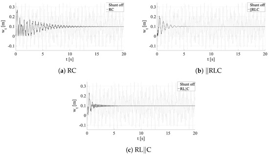 The numerical simulation results obtained for the tuned shunted circuits are reported in Figure 8 for comparison. The time histories of the solar panel tip vertical displacement, corresponding to the minimum points in Table 3, are also compared with the structural response of the open-loop case. It can be noted that the RC circuit provides an amount of damping to the structure but with a very high settling time. On the other hand, the time responses of the RL‖C circuit presents an overshoot of m, lower than the RC one, and completely suppressing the solar panel bending vibrations within 5 s. The best performance is given by the tuned ‖RLC circuit, being able to suppress the vibration in less than 5 s while presenting an overshoot of m.