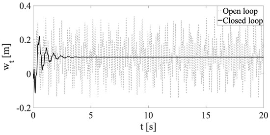 The displacement response of the solar panel tip, corresponding to the optimal point identified through the optimization procedure, is presented in Figure 10. The figure illustrates that the active control system effectively suppresses the bending vibrations of the solar panel within 4 s, achieving a maximum overshoot of m. This demonstrates the superior performance of the active control architecture compared to shunted circuit approaches, particularly in terms of settling time, while maintaining comparable levels of overshoot. These results highlight the advantages of the active control system when the smart structure is subjected to a step vertical displacement of the satellite.