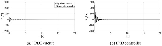 In order to compare the performance of the designed control systems, the voltage required by both the ‖RLC circuit, which exhibits the best solar panel tip time response among the studied shunted circuits, and the fPID controller is analyzed. The voltage output through each piezostack actuator is shown in Figure 11. It is worth noting that, in the case of the ‖RLC circuit, the upper and lower piezostack voltages are perfectly anti-phase, indicating that the imposed displacement excites purely bending vibrations. By comparing the actuation voltages in Figure 11, it can be observed that the ‖RLC circuit has a lower maximum peak, equal to , while the fPID controller requires a maximum voltage equal to the piezostack saturation value in the very first phase of the transient. Therefore, even though the fPID controller provides slightly better performance in terms of settling time, it requires a higher actuation voltage, reaching saturation, which could pose a problem in the presence of system uncertainties.