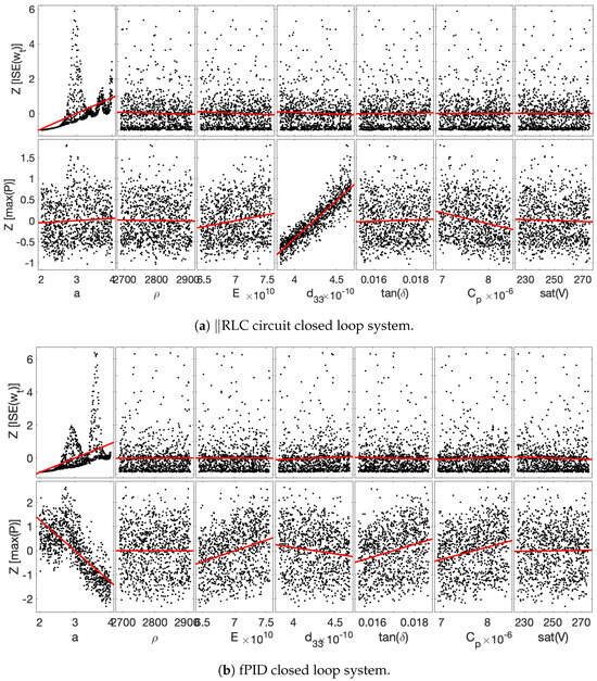 To assess the impact of the considered uncertainties on the performance of the vibration suppression systems, 1000 Monte Carlo simulations were carried out, taking into account the satellite’s attitude motion and randomly selecting the uncertain parameter values within the defined ranges. The results obtained were analyzed in terms of the Integral of Square Error (ISE) of the solar panel tip displacement and maximum power requested during the transient response. The results, standardized by means of a z-score method [59], are shown in Figure 13, where the linear regression line is also reported in red. The results indicate that the parameter with the greatest influence on the performance index ISE() for both closed-loop systems is the solar panel length. However, the maximum deviations of the performance index from the mean value are comparable. In contrast, a significant difference is observed in the maximum power demand. Specifically, for the shunted circuit system, the values of lie within the range , indicating a low correlation, whereas for the fPID system, the range is , with an inverse correlation. Additionally, a strong direct correlation is found between and the charge coefficient in the shunted circuit system, while in the fPID system, there is a slight inverse relationship.