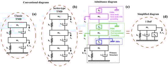 DVAs’ analogy of simplification for schematic diagrams based on the topology of mechanical networks to one-degree-of-freedom systems: (a) classical TMD schematic model [5]; (b) series TMD schematic model [15]; (c) generalized schematic diagram of DVAs based on the topology of mechanical networks using the concept of mechanical admittance; and (d) schematic diagram simplified by the global admittance.