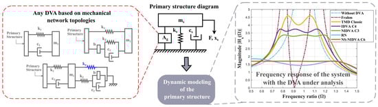 The study demonstrated that the global admittance function not only simplifies the analysis but also decouples the dynamic behavior of the DVA from the primary structure to some extent. This partial decoupling is achieved through the dimensionless function, , which depends on the forced-frequency ratio of the primary structure. As a result, this method could facilitate passive vibration control implementation in more complex and realistic structural models, making it easier to apply damping functions across a wide range of DVA designs based on mechanical network topologies.