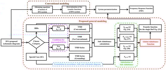 Comparative flowchart of conventional modeling versus the proposed general modeling based on global admittance, used to obtain the Frequency Response Function (FRF) of systems with DVAs, according to the topology of mechanical networks.
