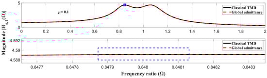 Comparison of the FRF of the conventional with the proposed model of the classical TMD, utilizing the optimal parameters outlined in Table 3 for a mass ratio , focusing on the first resonant point approach.