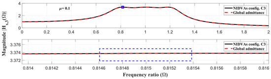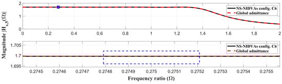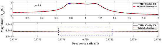 The FRFs of the vibration magnitude, , for the selected DVAs were evaluated and compared between the conventional modeling approach and the proposed global admittance methodology. Figure 4, Figure 5, Figure 6, Figure 7 and Figure 8 present these results for five distinct DVA configurations, demonstrating the effectiveness of the global admittance approach in accurately modeling the dynamic performance of vibration absorbers.