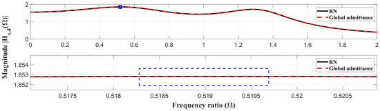 Following the procedure, the next step is directly linking global admittance to the system’s structural components and dynamic properties, which is achieved by substituting the terms and . For instance, the terms for and from Equation (15) can be replaced by using the transfer functions of Equations (A2) and (A3) (Appendix B), while the Equations (A4)–(A6) (Appendix B) can be used in Equation (16), which yields the following: