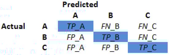 After obtaining the multiclass confusion matrix, several metrics can be derived to assess the performance of the classification model. The primary metrics are (Equation (5)), (Equation (6)), (Equation (7)), (Equation (8)), and (Equation (9)).