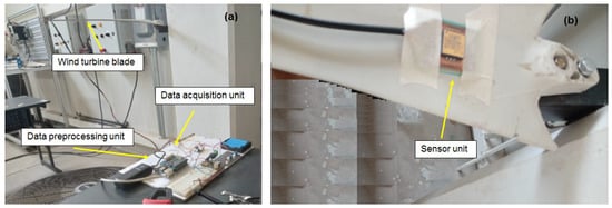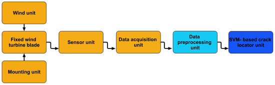 Figure 3 and Figure 4 depict the block diagram of the experimental configuration and the components needed to implement it, respectively. The experimental configuration diagram comprises three main sections. The first section contains a fixed WTB, a wind unit, a mounting unit, a sensor unit, and a data acquisition unit. The second section comprises a data preprocessing unit. Finally, the third section includes the SVM-based crack locator unit.