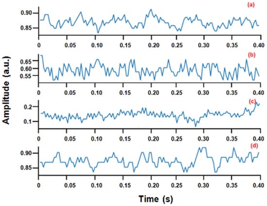 Time series of 0.4 s of the measured vibration signals with a (a) healthy WTB, (b) crack on the tip, (c) crack in the midsection, and (d) crack in the root.