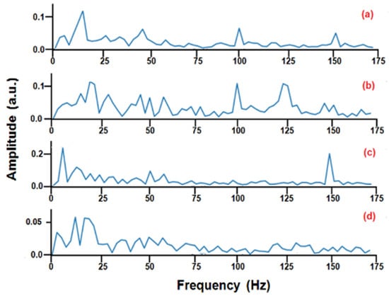 Spectral response of 0.4 s of the measured vibration signal with a (a) healthy WTB, (b) crack on the tip, (c) crack in the midsection, and (d) crack in the root.