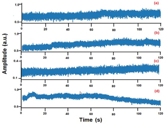 Time series of 120 s of the measured vibration signals with a (a) healthy WTB, (b) crack on the tip, (c) crack in the midsection, and (d) crack in the root.