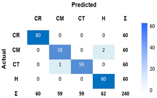 The results of the SVM model evaluation are shown in Figure 9. This figure shows the multiclass confusion matrix, which summarizes prediction results by comparing the actual and predicted labels. This matrix shows the number of instances classified into different categories: CR (crack in the root), CM (crack in the midsection), CT (crack in the tip), and H (healthy). The numbers in the matrix represent the count of instances correctly classified and misclassified for each category. For example, there were sixty instances of CR correctly classified, zero misclassified as CM, zero misclassified as CT, and zero misclassified as H in the CR. There were fifty-eight instances of CM correctly classified, zero misclassified as CR, zero misclassified as CT, and two misclassified as H in the CM. The numbers of false positives and false negatives suggest that the method was very accurate in differentiating between the healthy condition and the location of the crack in the WTB.